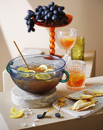 Bildunterschrift:Ägäischer Weinpunsch mit Zitronenscheiben und Crushed Ice