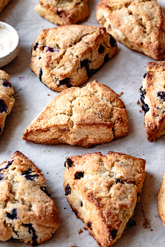 Frisch gebackene Heidelbeer-Scones auf Pergamentpapier.